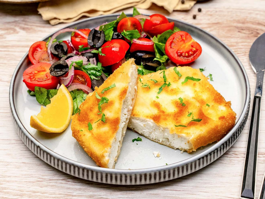 3.Sonnenblumenöl in einer großen Pfanne erhitzen. Panierten Feta bei mittlerer Hitze jeweils ca. 5 Minuten von beiden Seiten goldbraun backen. Auf Küchenpapier abtropfen lassen.